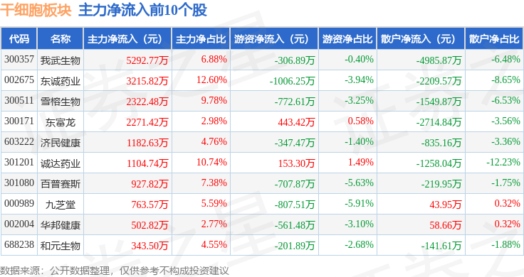 从资金流向上来看,当日干细胞板块主力资金净流出2.6亿元,游资资金净流入8927.47万元,散户资金净流入1.71亿元。干细胞板块个股资金流向见下表: