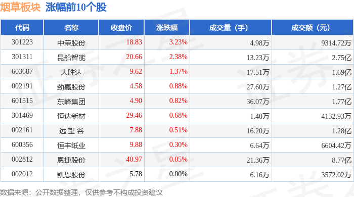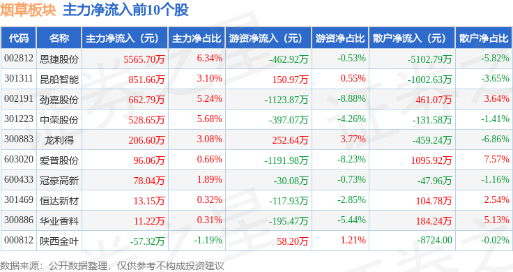 从资金流向上来看,当日烟草板块主力资金净流出1.17亿元,游资资金净流入1813.88万元,散户资金净流入9852.61万元。烟草板块个股资金流向见下表: