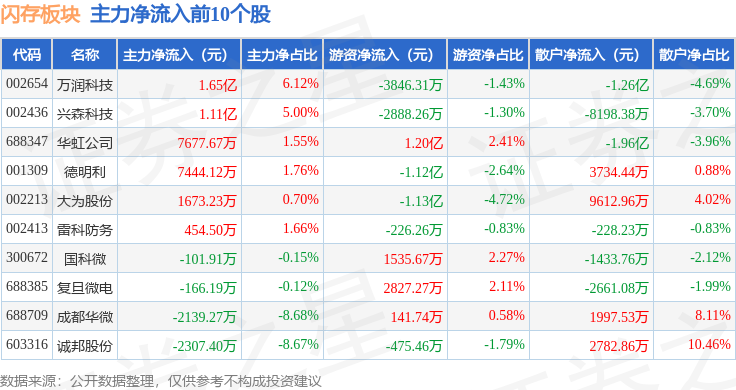从资金流向上来看,当日闪存板块主力资金净流出34.39亿元,游资资金净流入10.39亿元,散户资金净流入24.0亿元。闪存板块个股资金流向见下表: