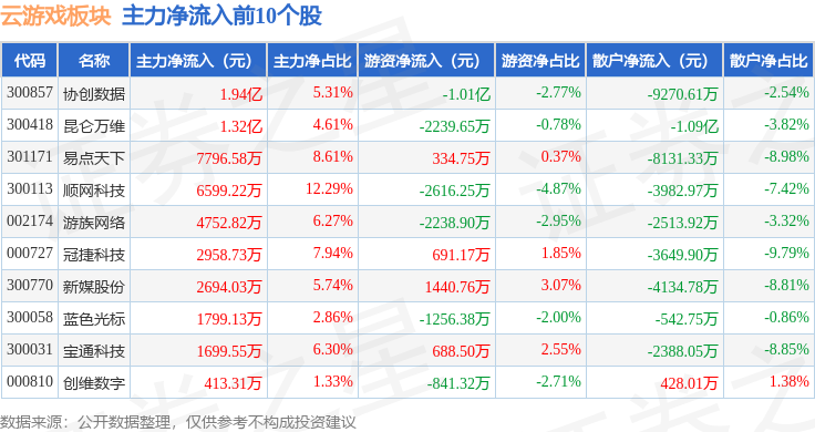 从资金流向上来看,当日云游戏板块主力资金净流出8.16亿元,游资资金净流出4202.75万元,散户资金净流入8.58亿元。云游戏板块个股资金流向见下表: