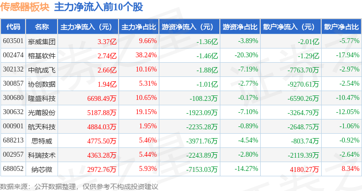 从资金流向上来看,当日传感器板块主力资金净流出30.44亿元,游资资金净流入1.62亿元,散户资金净流入28.81亿元。传感器板块个股资金流向见下表: