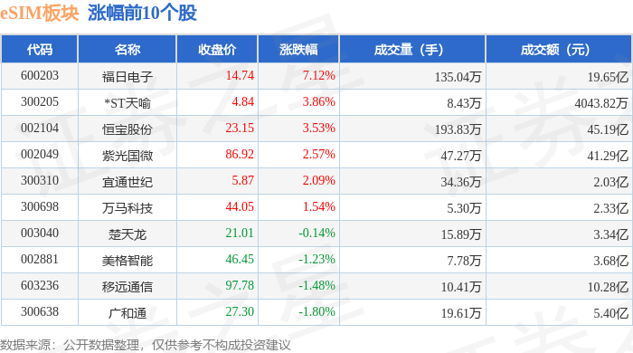 证券之星消息,10月28日eSIM板块较上一交易日上涨0.8%,福日电子领涨。当日上证指数报收于3988.22,下跌0.22%。深证成指报收于13430.1,下跌0.44%。eSIM板块个股涨跌见下表: