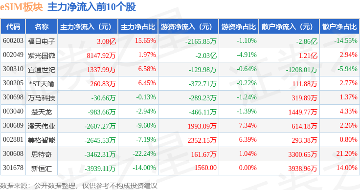从资金流向上来看,当日eSIM板块主力资金净流出4.1亿元,游资资金净流入1233.75万元,散户资金净流入3.97亿元。eSIM板块个股资金流向见下表: