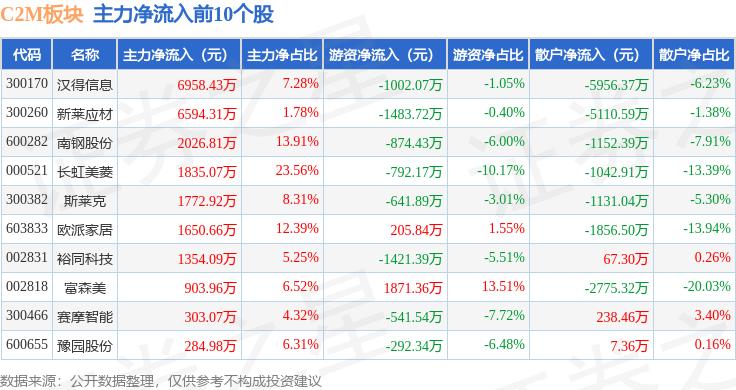 从资金流向上来看,当日C2M板块主力资金净流出2.92亿元,游资资金净流入1.34亿元,散户资金净流入1.58亿元。C2M板块个股资金流向见下表: