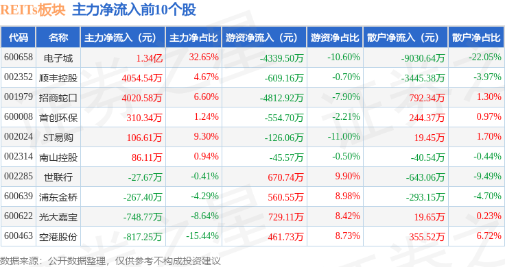 从资金流向上来看,当日REITs板块主力资金净流出4.59亿元,游资资金净流出4727.84万元,散户资金净流入5.07亿元。REITs板块个股资金流向见下表: