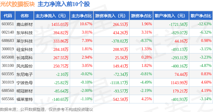 从资金流向上来看,当日光伏胶膜板块主力资金净流出8.53亿元,游资资金净流入2.29亿元,散户资金净流入6.24亿元。光伏胶膜板块个股资金流向见下表: