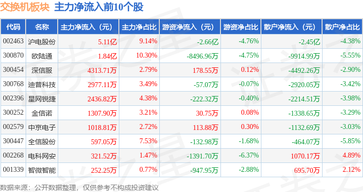 从资金流向上来看,当日交换机板块主力资金净流出17.74亿元,游资资金净流入4.33亿元,散户资金净流入13.41亿元。交换机板块个股资金流向见下表: