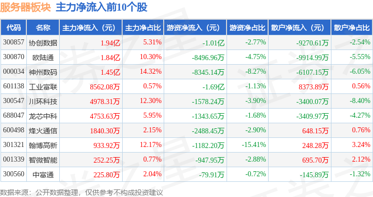 从资金流向上来看,当日服务器板块主力资金净流出35.36亿元,游资资金净流入12.43亿元,散户资金净流入22.93亿元。服务器板块个股资金流向见下表: