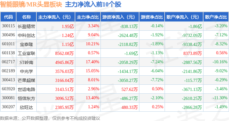 从资金流向上来看,当日智能眼镜/MR头显板块主力资金净流出57.56亿元,游资资金净流入17.04亿元,散户资金净流入40.52亿元。智能眼镜/MR头显板块个股资金流向见下表:
