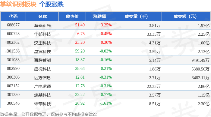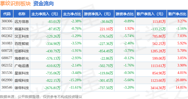 从资金流向上来看,当日掌纹识别板块主力资金净流出6486.78万元,游资资金净流出3152.56万元,散户资金净流入9639.33万元。掌纹识别板块个股资金流向见下表: