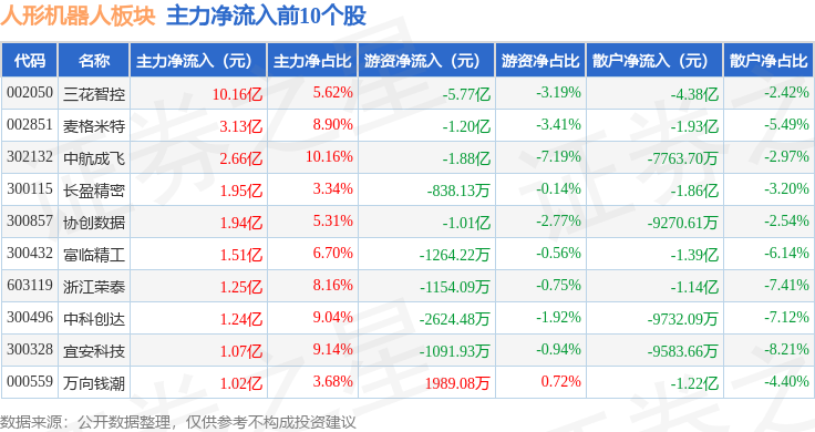 从资金流向上来看,当日人形机器人板块主力资金净流出14.73亿元,游资资金净流出1.77亿元,散户资金净流入16.51亿元。人形机器人板块个股资金流向见下表:
