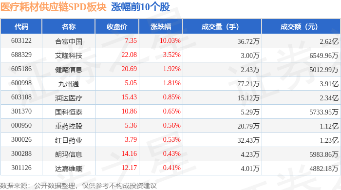 证券之星消息,10月28日医疗耗材供应链SPD板块较上一交易日上涨0.15%,合富中国领涨。当日上证指数报收于3988.22,下跌0.22%。深证成指报收于13430.1,下跌0.44%。医疗耗材供应链SPD板块个股涨跌见下表:
