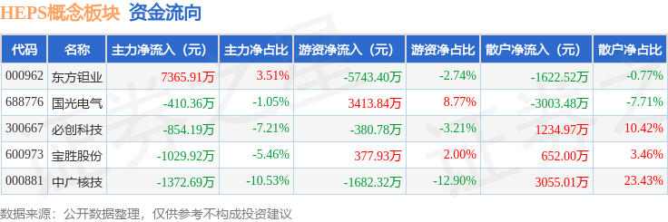 从资金流向上来看,当日HEPS概念板块主力资金净流入3698.75万元,游资资金净流出4014.74万元,散户资金净流入315.99万元。HEPS概念板块个股资金流向见下表: