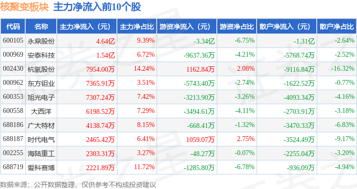 从资金流向上来看,当日核聚变板块主力资金净流出22.85亿元,游资资金净流出5143.56万元,散户资金净流入23.36亿元。核聚变板块个股资金流向见下表: