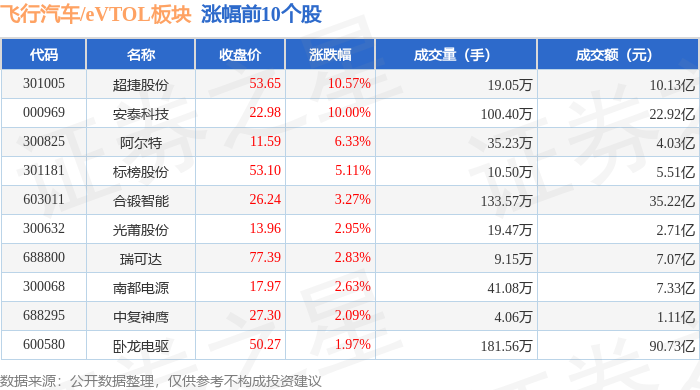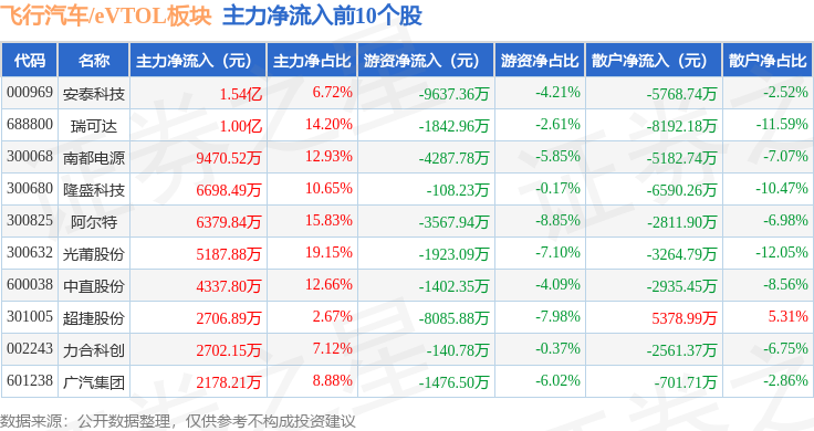 从资金流向上来看,当日飞行汽车/eVTOL板块主力资金净流出9.51亿元,游资资金净流出2.09亿元,散户资金净流入11.6亿元。飞行汽车/eVTOL板块个股资金流向见下表: