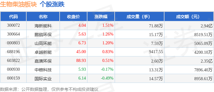 证券之星消息,10月28日生物柴油板块较上一交易日上涨0.65%,海新能科领涨。当日上证指数报收于3988.22,下跌0.22%。深证成指报收于13430.1,下跌0.44%。生物柴油板块个股涨跌见下表: