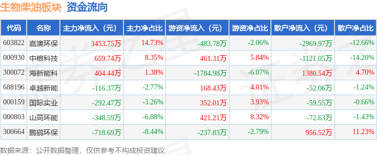 从资金流向上来看,当日生物柴油板块主力资金净流入3041.83万元,游资资金净流出1103.63万元,散户资金净流出1938.19万元。生物柴油板块个股资金流向见下表:
