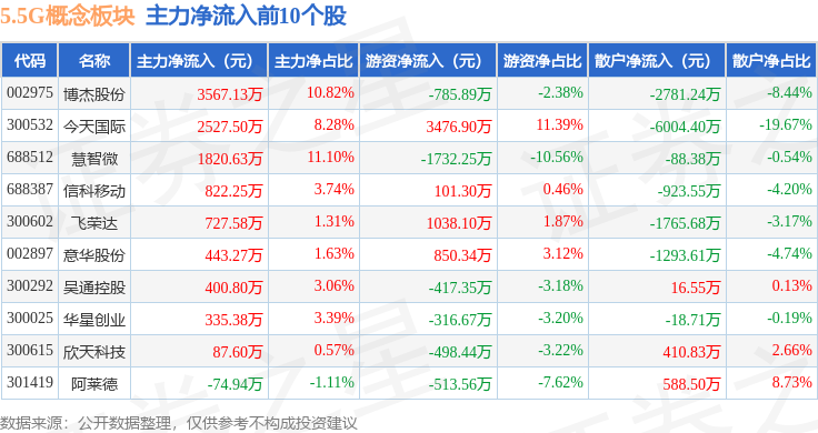 从资金流向上来看,当日5.5G概念板块主力资金净流出16.27亿元,游资资金净流入7.61亿元,散户资金净流入8.66亿元。5.5G概念板块个股资金流向见下表:
