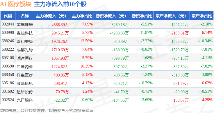 从资金流向上来看,当日AI 医疗板块主力资金净流出5916.63万元,游资资金净流出1.03亿元,散户资金净流入1.62亿元。AI 医疗板块个股资金流向见下表: