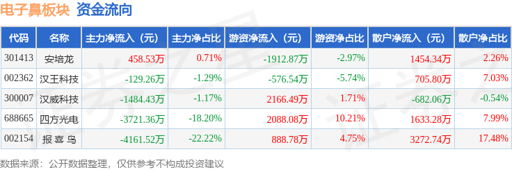 从资金流向上来看,当日电子鼻板块主力资金净流出9038.04万元,游资资金净流入2653.95万元,散户资金净流入6384.1万元。电子鼻板块个股资金流向见下表:
