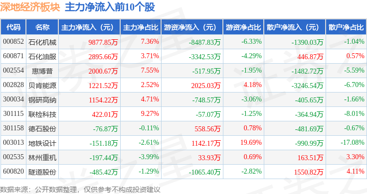 从资金流向上来看,当日深地经济板块主力资金净流出6.69亿元,游资资金净流出4414.49万元,散户资金净流入7.13亿元。深地经济板块个股资金流向见下表: