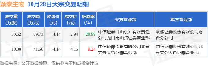 证券之星消息,10月28日颖泰生物发生大宗交易,交易数据如下: