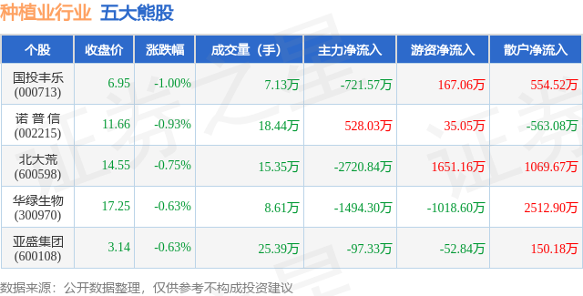 个股表现方面,种植业行业当日领跌股为国投丰乐(000713),该股当日报收6.95,下跌1.0%,成交量7.13万,主力资金净流出721.57万元。诺 普 信(002215)以下跌0.93%紧随其后,该股当日成交量18.44万,主力资金净流入528.03万元。除此之外,北大荒(600598)、华绿生物(300970)、亚盛集团(600108)均进入当日熊股之列。具体个股列表见下表: