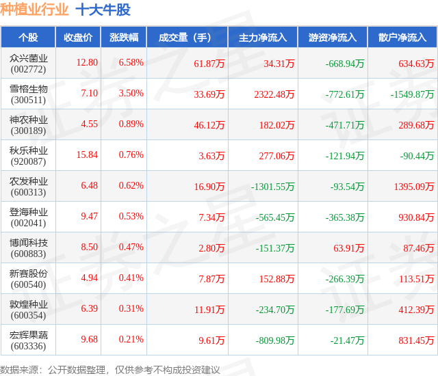 个股表现方面,种植业行业当日领涨股为众兴菌业(002772),该股当日报收12.8,上涨6.58%,成交量61.87万,主力资金净流入34.31万元。雪榕生物(300511)以上涨3.5%紧随其后,该股当日成交量33.69万,主力资金净流入2322.48万元。除此之外,神农种业(300189)、秋乐种业(920087)、农发种业(600313)均进入当日牛股之列。具体个股列表见下表: