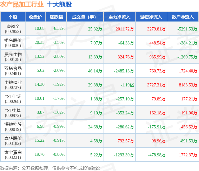 个股表现方面,农产品加工行业当日领跌股为道道全(002852),该股当日报收10.68,下跌6.32%,成交量25.32万,主力资金净流入2011.72万元。祖名股份(003030)以下跌3.55%紧随其后,该股当日成交量7.07万,主力资金净流出64.33万元。除此之外,晨光生物(300138)、双塔食品(002481)、中粮糖业(600737)均进入当日熊股之列。具体个股列表见下表: