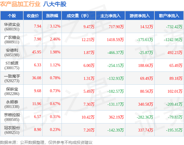 个股表现方面,农产品加工行业当日领涨股为华资实业(600191),该股当日报收7.94,上涨3.12%,成交量9.47万,主力资金净流入717.9万元。广农糖业(000911)以上涨2.46%紧随其后,该股当日成交量12.23万,主力资金净流入1418.59万元。除此之外,安德利(605198)、ST朗源(300175)、一致魔芋(920273)均进入当日牛股之列。具体个股列表见下表: