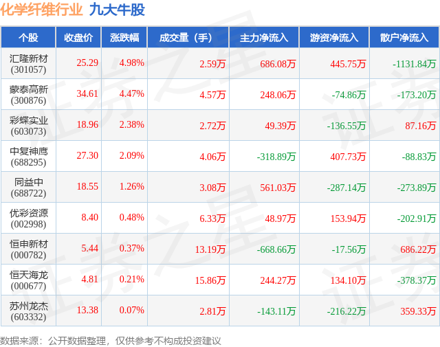 个股表现方面,化学纤维行业当日领涨股为汇隆新材(301057),该股当日报收25.29,上涨4.98%,成交量2.59万,主力资金净流入686.08万元。蒙泰高新(300876)以上涨4.47%紧随其后,该股当日成交量4.57万,主力资金净流入248.06万元。除此之外,彩蝶实业(603073)、中复神鹰(688295)、同益中(688722)均进入当日牛股之列。具体个股列表见下表: