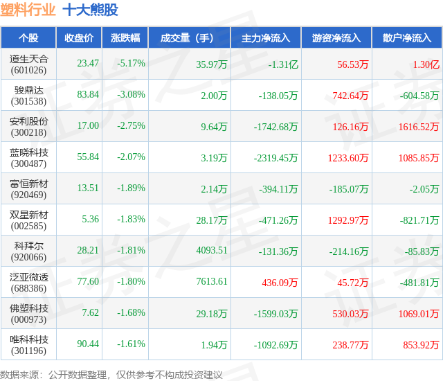 个股表现方面,塑料行业当日领跌股为道生天合(601026),该股当日报收23.47,下跌5.17%,成交量35.97万,主力资金净流出1.31亿元。骏鼎达(301538)以下跌3.08%紧随其后,该股当日成交量2.0万,主力资金净流出138.05万元。除此之外,安利股份(300218)、蓝晓科技(300487)、富恒新材(920469)均进入当日熊股之列。具体个股列表见下表: