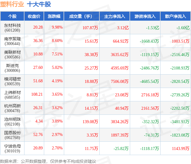 个股表现方面,塑料行业当日领涨股为东材科技(601208),该股当日报收20.28,上涨9.98%,成交量107.87万,主力资金净流入3.12亿元。南京聚隆(300644)以上涨8.6%紧随其后,该股当日成交量15.61万,主力资金净流入664.92万元。除此之外,美联新材(300586)、斯迪克(300806)、横河精密(300539)均进入当日牛股之列。具体个股列表见下表: