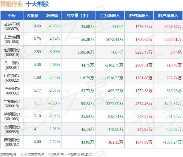 个股表现方面,普钢行业当日领跌股为武进不锈(603878),该股当日报收10.6,下跌4.85%,成交量35.68万,主力资金净流出1.0亿元。友发集团(601686)以下跌4.24%紧随其后,该股当日成交量56.28万,主力资金净流出5072.44万元。除此之外,包钢股份(600010)、八一钢铁(600581)、山东钢铁(600022)均进入当日熊股之列。具体个股列表见下表: