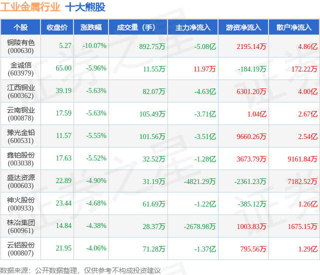 个股表现方面,工业金属行业当日领跌股为铜陵有色(000630),该股当日报收5.27,下跌10.07%,成交量892.75万,主力资金净流出5.08亿元。金诚信(603979)以下跌5.96%紧随其后,该股当日成交量11.55万,主力资金净流入11.97万元。除此之外,江西铜业(600362)、云南铜业(000878)、豫光金铅(600531)均进入当日熊股之列。具体个股列表见下表: