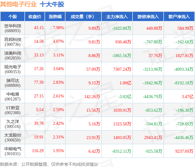 个股表现方面,其他电子行业当日领涨股为世华科技(688093),该股当日报收43.15,上涨7.98%,成交量9.89万,主力资金净流出1025.88万元。百邦科技(300736)以上涨4.07%紧随其后,该股当日成交量9.81万,主力资金净流入930.48万元。除此之外,洁美科技(002859)、旭光电子(600353)、瑞可达(688800)均进入当日牛股之列。具体个股列表见下表: