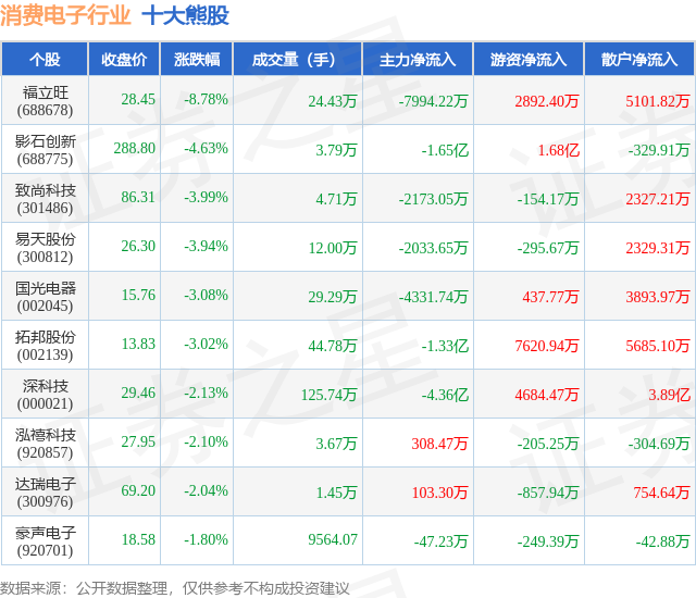 个股表现方面,消费电子行业当日领跌股为福立旺(688678),该股当日报收28.45,下跌8.78%,成交量24.43万,主力资金净流出7994.22万元。影石创新(688775)以下跌4.63%紧随其后,该股当日成交量3.79万,主力资金净流出1.65亿元。除此之外,致尚科技(301486)、易天股份(300812)、国光电器(002045)均进入当日熊股之列。具体个股列表见下表: