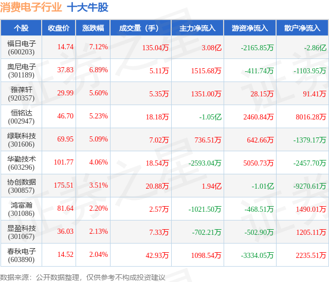 个股表现方面,消费电子行业当日领涨股为福日电子(600203),该股当日报收14.74,上涨7.12%,成交量135.04万,主力资金净流入3.08亿元。奥尼电子(301189)以上涨6.89%紧随其后,该股当日成交量5.11万,主力资金净流入1515.68万元。除此之外,雅葆轩(920357)、恒铭达(002947)、绿联科技(301606)均进入当日牛股之列。具体个股列表见下表: