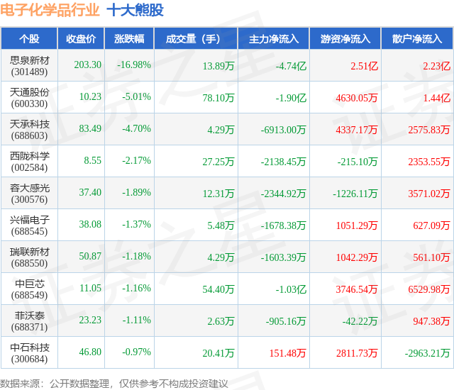 个股表现方面,电子化学品行业当日领跌股为思泉新材(301489),该股当日报收203.3,下跌16.98%,成交量13.89万,主力资金净流出4.74亿元。天通股份(600330)以下跌5.01%紧随其后,该股当日成交量78.1万,主力资金净流出1.9亿元。除此之外,天承科技(688603)、西陇科学(002584)、容大感光(300576)均进入当日熊股之列。具体个股列表见下表: