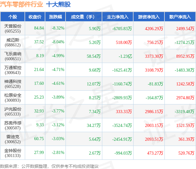 个股表现方面,汽车零部件行业当日领跌股为天普股份(605255),该股当日报收84.84,下跌8.32%,成交量5.9万,主力资金净流出6705.83万元。威迈斯(688612)以下跌8.04%紧随其后,该股当日成交量5.2万,主力资金净流入518.0万元。除此之外,飞乐音响(600651)、万通智控(300643)、神通科技(605228)均进入当日熊股之列。具体个股列表见下表: