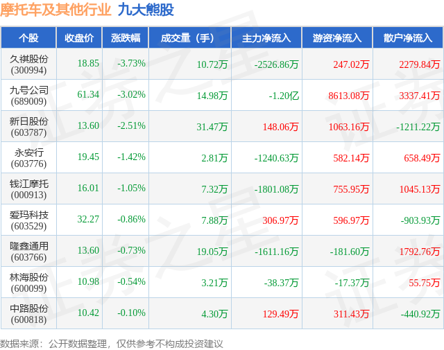 个股表现方面,摩托车及其他行业当日领跌股为久祺股份(300994),该股当日报收18.85,下跌3.73%,成交量10.72万,主力资金净流出2526.86万元。九号公司(689009)以下跌3.02%紧随其后,该股当日成交量14.98万,主力资金净流出1.2亿元。除此之外,新日股份(603787)、永安行(603776)、钱江摩托(000913)均进入当日熊股之列。具体个股列表见下表: