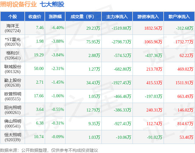 个股表现方面,照明设备行业当日领跌股为海洋王(002724),该股当日报收7.46,下跌6.4%,成交量29.23万,主力资金净流出1519.88万元。*ST星光(002076)以下跌3.88%紧随其后,该股当日成交量75.95万,主力资金净流出2798.73万元。除此之外,格利尔(920641)、联域股份(001326)、勤上股份(002638)均进入当日熊股之列。具体个股列表见下表: