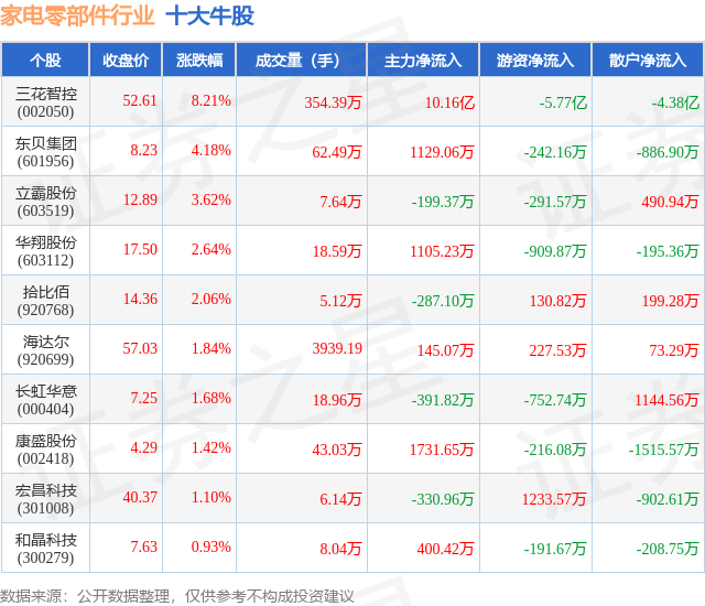 个股表现方面,家电零部件行业当日领涨股为三花智控(002050),该股当日报收52.61,上涨8.21%,成交量354.39万,主力资金净流入10.16亿元。东贝集团(601956)以上涨4.18%紧随其后,该股当日成交量62.49万,主力资金净流入1129.06万元。除此之外,立霸股份(603519)、华翔股份(603112)、拾比佰(920768)均进入当日牛股之列。具体个股列表见下表: