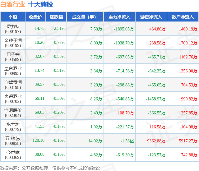 个股表现方面,白酒行业当日领跌股为伊力特(600197),该股当日报收14.75,下跌2.51%,成交量7.5万,主力资金净流出1895.05万元。金种子酒(600199)以下跌0.77%紧随其后,该股当日成交量8.0万,主力资金净流出1938.7万元。除此之外,口子窖(603589)、皇台酒业(000995)、迎驾贡酒(603198)均进入当日熊股之列。具体个股列表见下表: