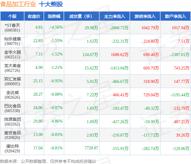 个股表现方面,食品加工行业当日领跌股为*ST春天(600381),该股当日报收4.81,下跌4.56%,成交量29.98万,主力资金净流出2060.73万元。仙乐健康(300791)以下跌1.55%紧随其后,该股当日成交量1.63万,主力资金净流出232.31万元。除此之外,金字火腿(002515)、龙大美食(002726)、双汇发展(000895)均进入当日熊股之列。具体个股列表见下表: