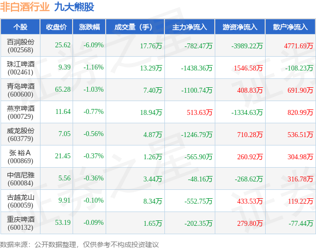 个股表现方面,非白酒行业当日领跌股为百润股份(002568),该股当日报收25.62,下跌6.09%,成交量17.76万,主力资金净流出782.47万元。珠江啤酒(002461)以下跌1.16%紧随其后,该股当日成交量13.29万,主力资金净流出1438.36万元。除此之外,青岛啤酒(600600)、燕京啤酒(000729)、威龙股份(603779)均进入当日熊股之列。具体个股列表见下表: