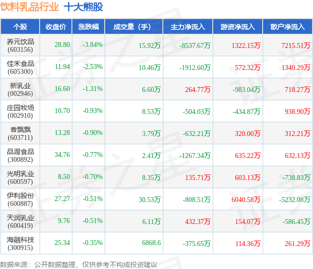 个股表现方面,饮料乳品行业当日领跌股为养元饮品(603156),该股当日报收28.8,下跌3.84%,成交量15.92万,主力资金净流出8537.67万元。佳禾食品(605300)以下跌2.53%紧随其后,该股当日成交量10.46万,主力资金净流出1912.6万元。除此之外,新乳业(002946)、庄园牧场(002910)、香飘飘(603711)均进入当日熊股之列。具体个股列表见下表: