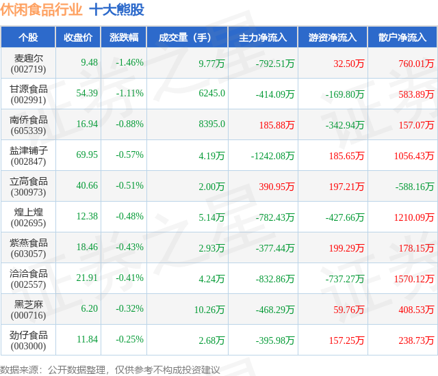 个股表现方面,休闲食品行业当日领跌股为麦趣尔(002719),该股当日报收9.48,下跌1.46%,成交量9.77万,主力资金净流出792.51万元。甘源食品(002991)以下跌1.11%紧随其后,该股当日成交量6245.0,主力资金净流出414.09万元。除此之外,南侨食品(605339)、盐津铺子(002847)、立高食品(300973)均进入当日熊股之列。具体个股列表见下表:
