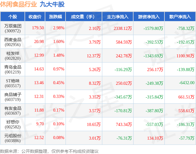 个股表现方面,休闲食品行业当日领涨股为万辰集团(300972),该股当日报收179.5,上涨2.98%,成交量2.1万,主力资金净流入2338.12万元。西麦食品(002956)以上涨1.6%紧随其后,该股当日成交量3.79万,主力资金净流入584.59万元。除此之外,桂发祥(002820)、青岛食品(001219)、ST绝味(603517)均进入当日牛股之列。具体个股列表见下表: