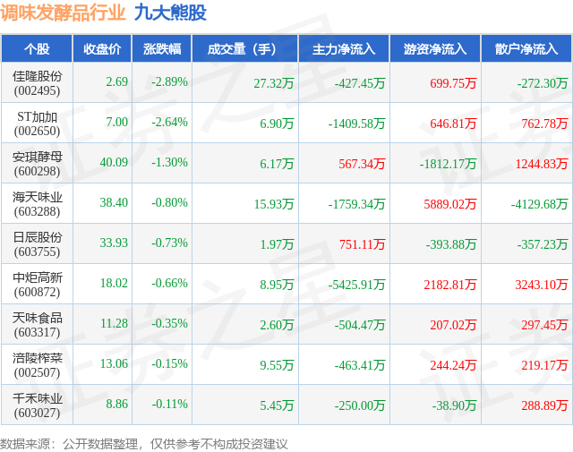 个股表现方面,调味发酵品行业当日领跌股为佳隆股份(002495),该股当日报收2.69,下跌2.89%,成交量27.32万,主力资金净流出427.45万元。ST加加(002650)以下跌2.64%紧随其后,该股当日成交量6.9万,主力资金净流出1409.58万元。除此之外,安琪酵母(600298)、海天味业(603288)、日辰股份(603755)均进入当日熊股之列。具体个股列表见下表: